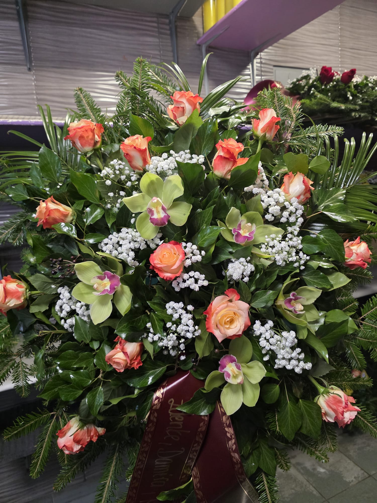 Vijenac kao na slici. Mogućnost odabira drugih boja (crvena, bijela…) i drugog cvijeća (cijena na upit). Dostava na sva groblja na području Grada Zagreba.
